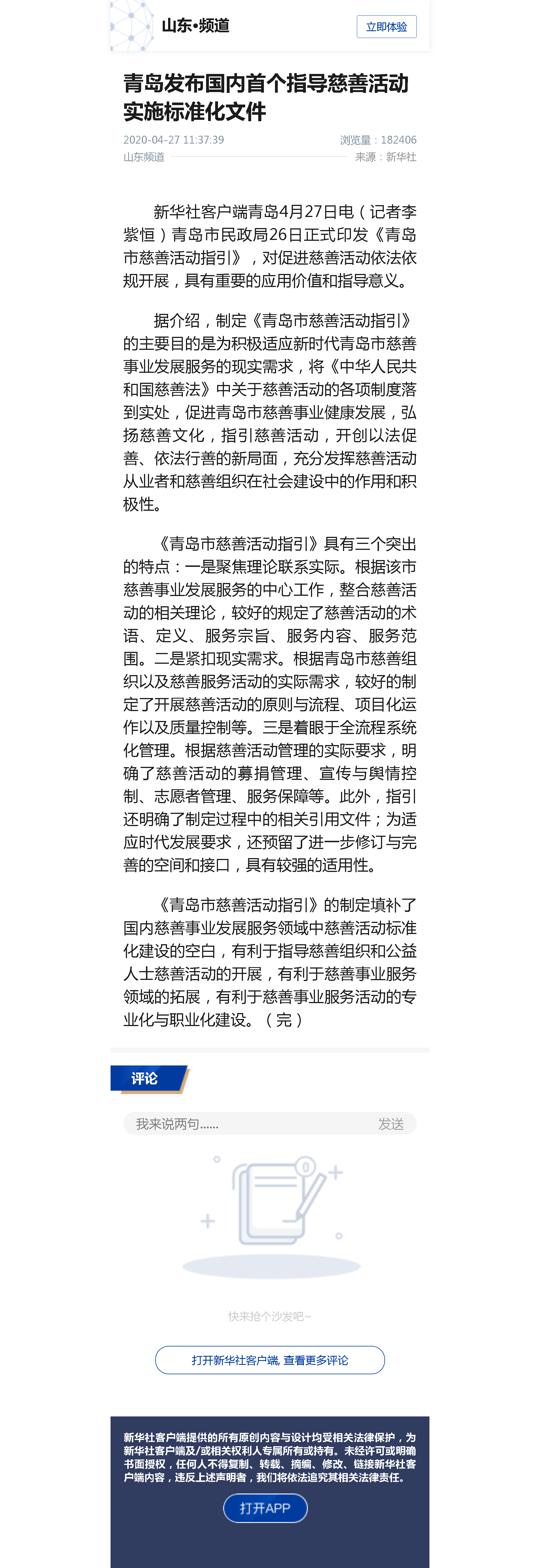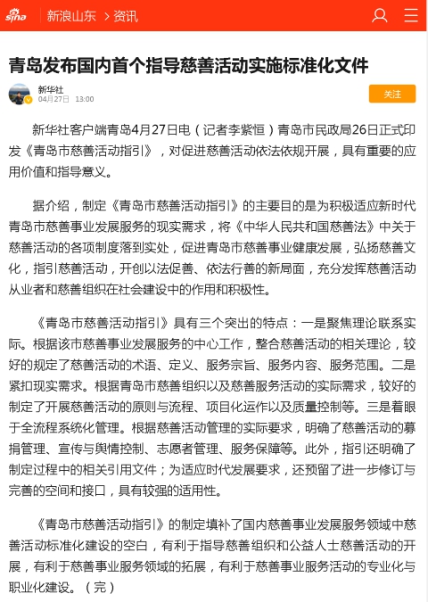 新浪新聞:青島發(fā)布國(guó)內(nèi)首個(gè)指導(dǎo)慈善活動(dòng)實(shí)施標(biāo)準(zhǔn)化文件