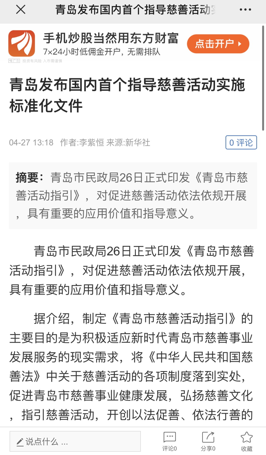 東方財(cái)富網(wǎng):青島發(fā)布國(guó)內(nèi)首個(gè)指導(dǎo)慈善活動(dòng)實(shí)施標(biāo)準(zhǔn)化文件
