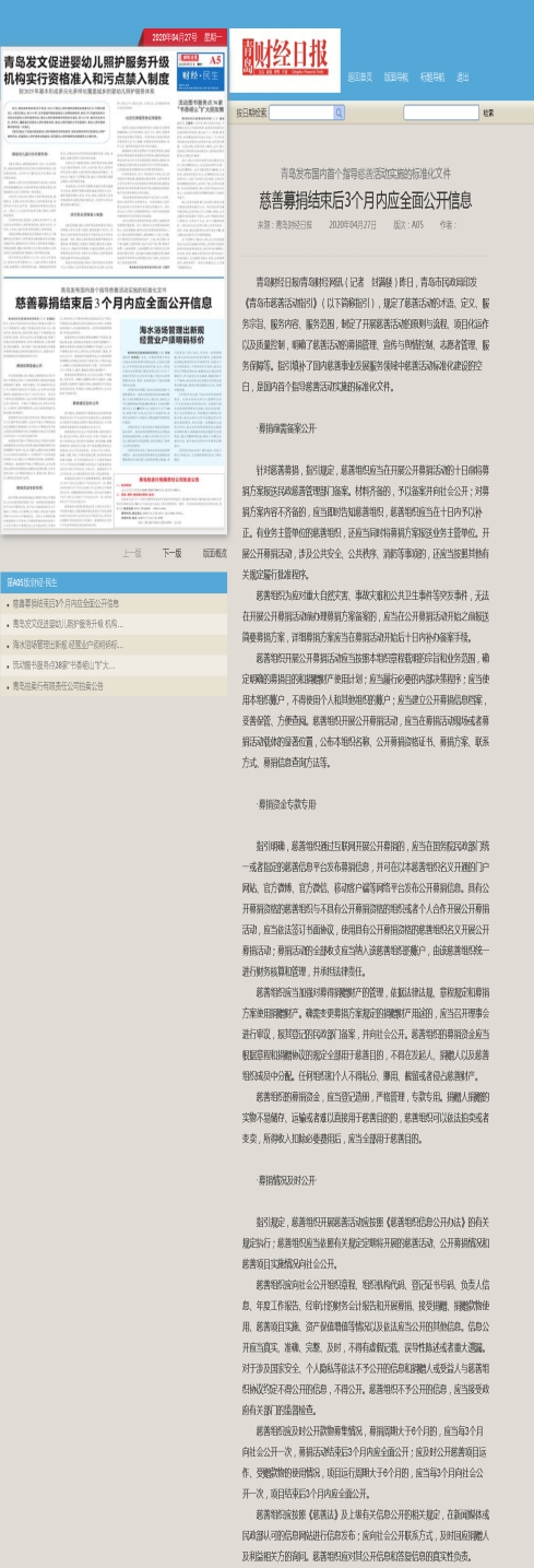 青島財(cái)經(jīng)日?qǐng)?bào):青島發(fā)布國(guó)內(nèi)首個(gè)指導(dǎo)慈善活動(dòng)實(shí)施的標(biāo)準(zhǔn)化文件慈善募捐結(jié)束后3個(gè)月內(nèi)應(yīng)全面公開(kāi)信息