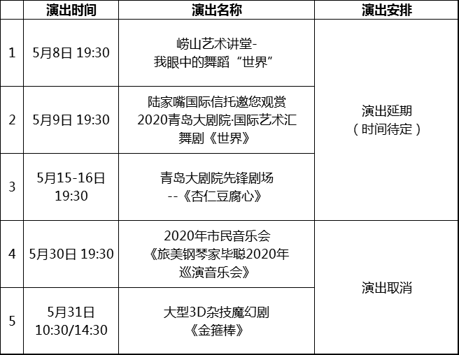 根據(jù)行業(yè)上級關(guān)于新型冠狀病毒感染肺炎疫情防控工作的部署及疫情防控最新情況,為切實保障人民群眾身體健康和生命安全,經(jīng)慎重研究并與演出各主辦方協(xié)商,現(xiàn)對原定于5月份舉辦的5個項目7場演出進(jìn)行調(diào)整。
