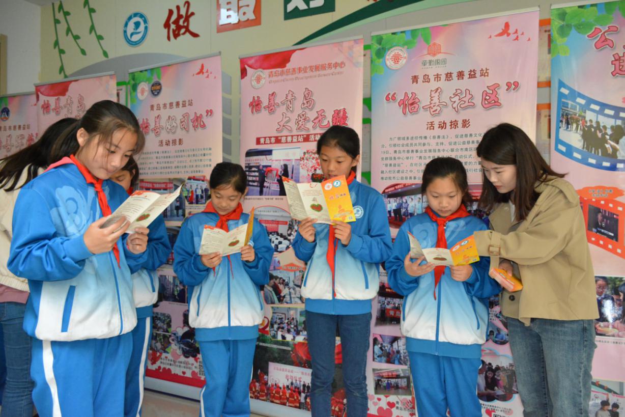 紅島中心小學的學生們在青島市慈善益站“怡善悅讀”專區(qū)閱讀《慈善法》相關(guān)書籍