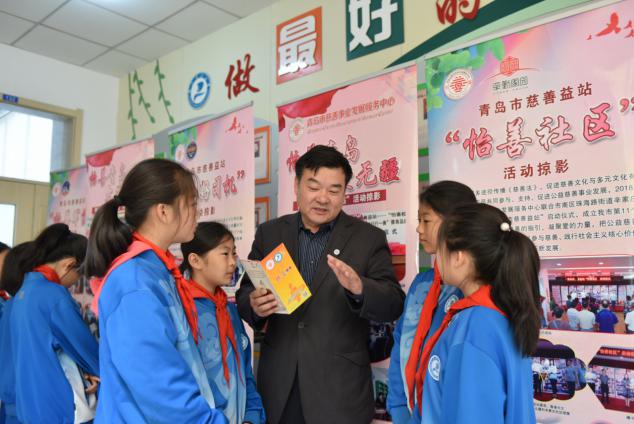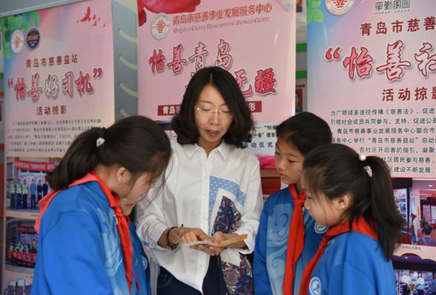 青島市慈善事業(yè)發(fā)展服務(wù)中心工作人員向小學生發(fā)放《慈善法》宣傳折頁