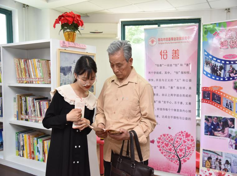 社區(qū)居民在青島市慈善益站“怡善悅讀”專區(qū)閱讀《慈善法》相關(guān)書籍