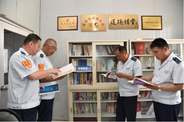 青島市慈善益站“怡善巴士”——青島公交嶗山巴士第六分公司職工在青島市慈善益站“怡善悅讀”專區(qū)閱讀《慈善法》相關(guān)書籍
