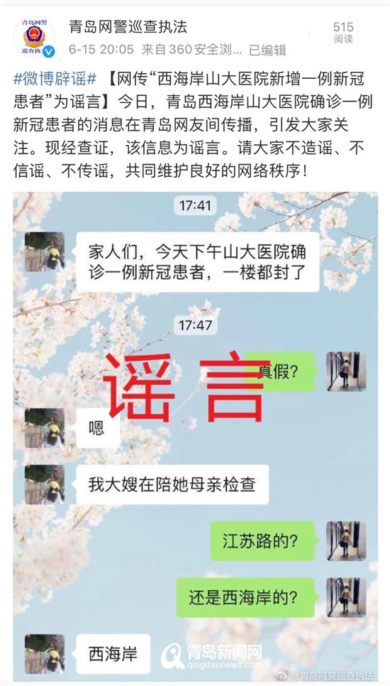 青島新聞網(wǎng)6月15日訊(記者丁淑華)6月15日,一則“青島西海岸山大醫(yī)院確診一例新冠患者”的微信聊天截圖在青島人的朋友圈中傳播,引發(fā)網(wǎng)友關(guān)注。經(jīng)青島網(wǎng)警查證,該信息為謠言,請大家不造謠、不信謠、不傳謠,關(guān)注官方發(fā)布,共同維護(hù)良好的網(wǎng)絡(luò)秩序。