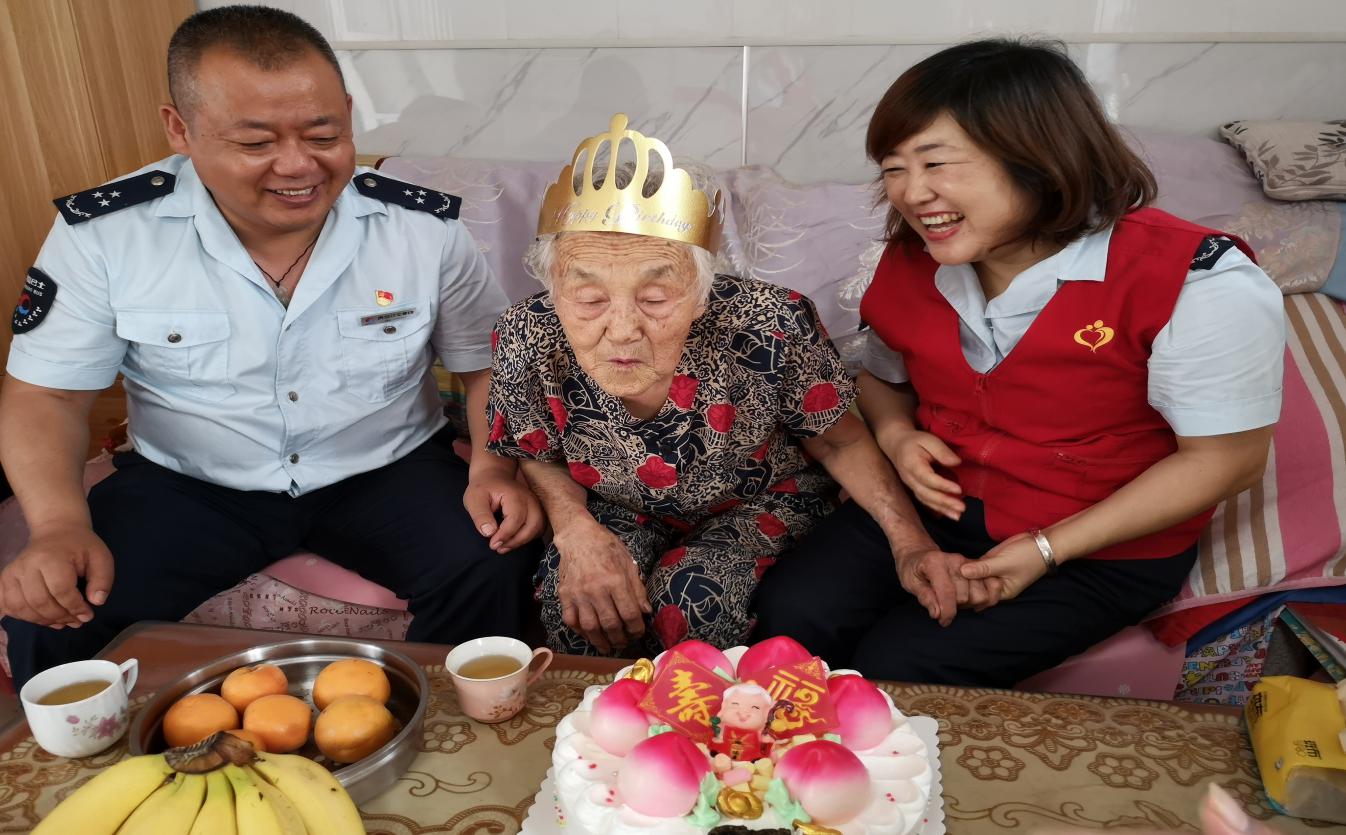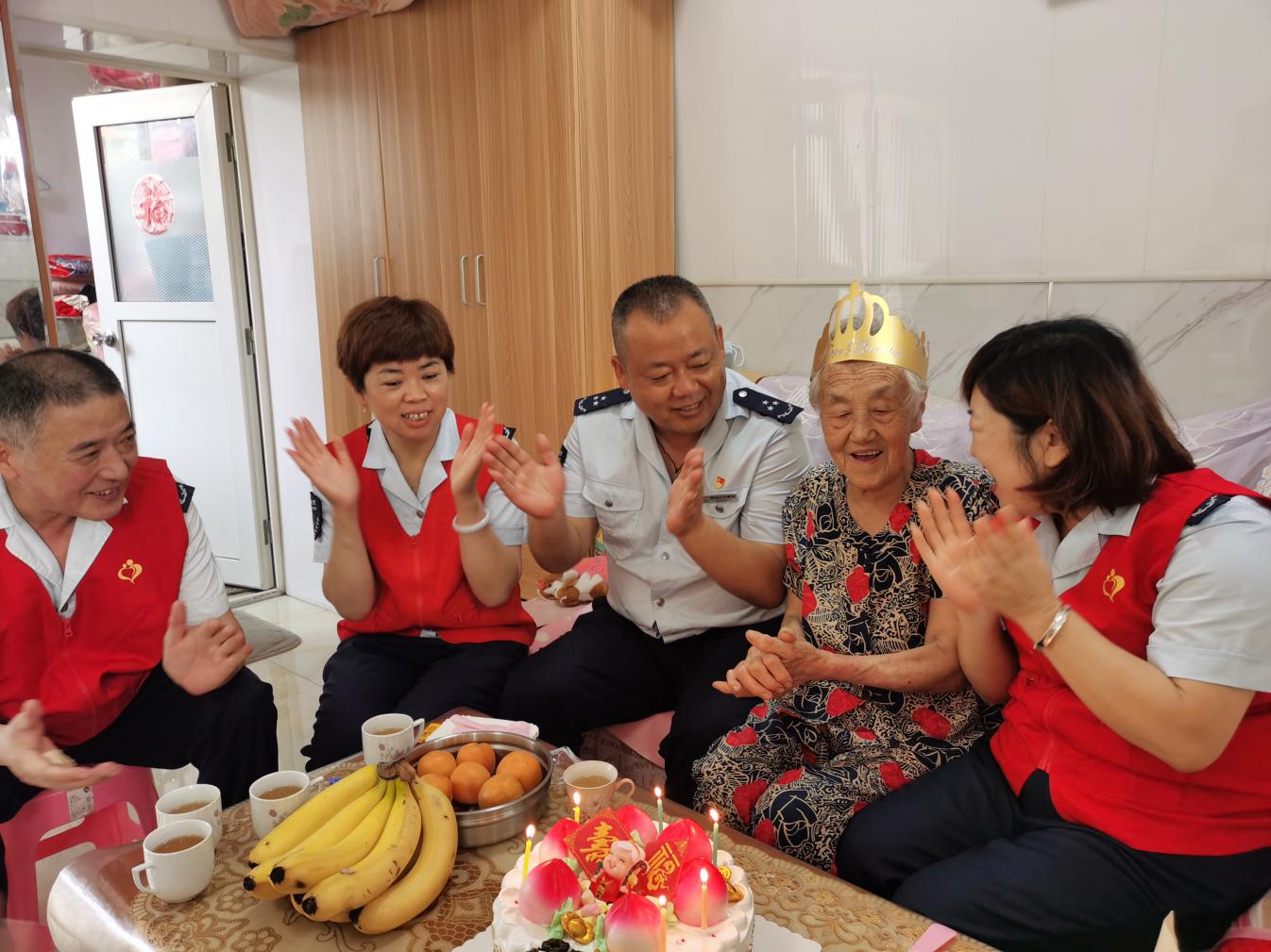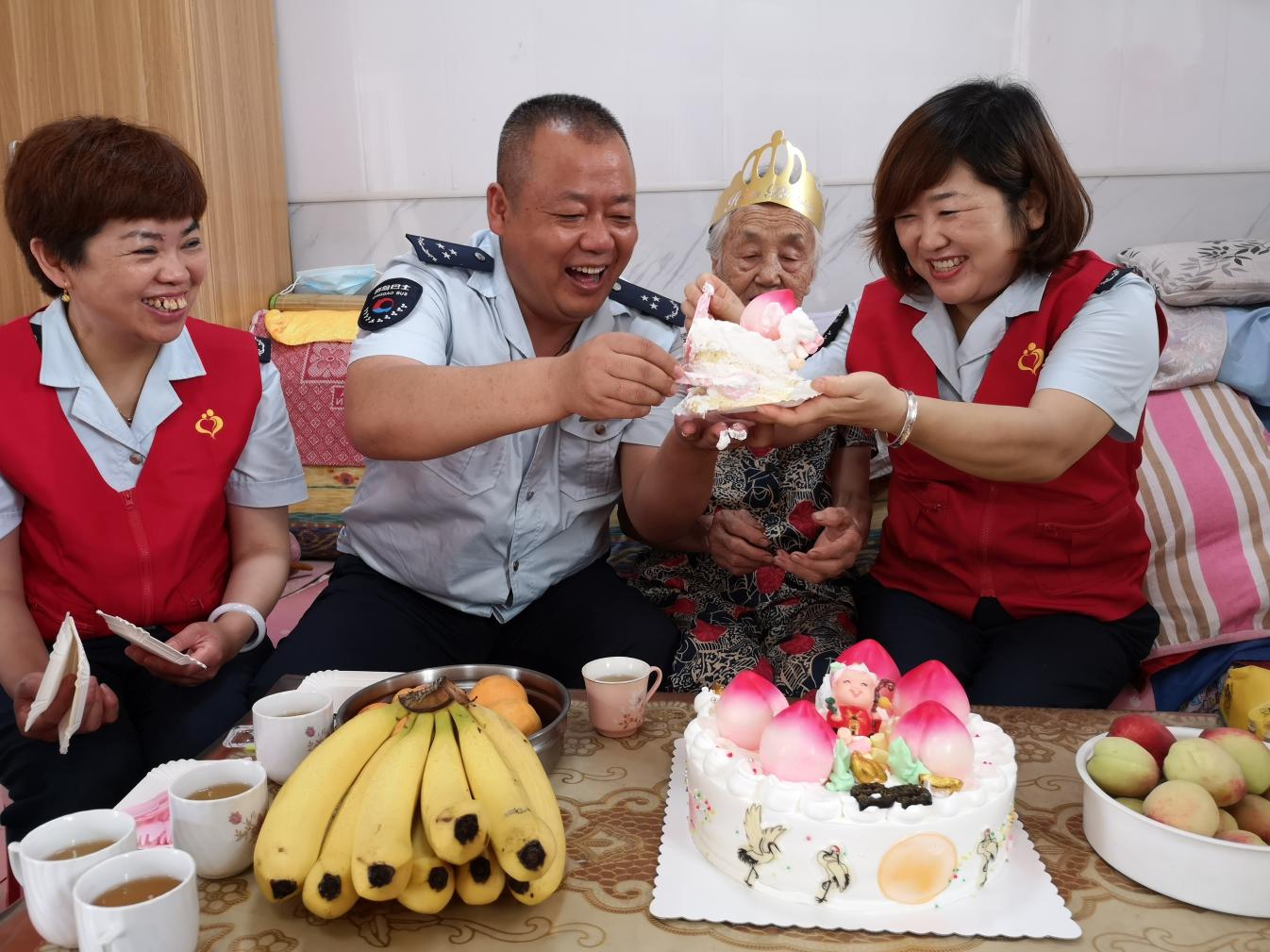志愿者們還有一件非常高興的事要辦,為結(jié)對的空巢老人王淑蘭阿姨慶賀85歲大壽的日子。這是志愿者們連續(xù)五年為王阿姨慶賀生日了,一進(jìn)門,就看見桌上洗好的杏和新鮮桃子,這是王阿姨在等候志愿者的到來。王阿姨高興的看看這個(gè),瞧瞧那個(gè),拉著志愿者的手有著說不完的話。志愿者們告訴王阿姨今天是特意來為她老人家慶賀85歲大壽的,老人家很是高興和激動,說道,“你們工作這么辛苦,還要時(shí)刻惦記我們這些老人讓我說啥好”。志愿者將生日蛋糕打開,寓意著福壽安康的喜慶蛋糕讓人眼前一亮,王阿姨直夸蛋糕做的精美。志愿者們將生日蠟燭點(diǎn)上,共同唱起生日祝福歌,歡樂融合的幸福景象盡顯眼前。