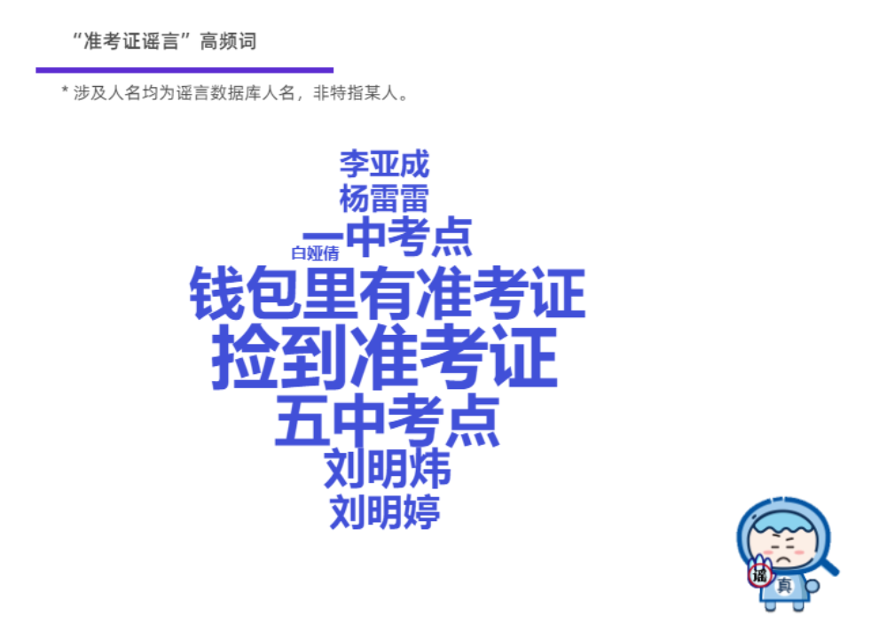 丟準(zhǔn)考證事件每年都有發(fā)生,一方面讓信息真假難辨,迷惑性強(qiáng),不少網(wǎng)民正出于善于轉(zhuǎn)發(fā),給了謠言可乘之機(jī);另一方面,其較高的出現(xiàn)頻率、舊謠新傳等特點(diǎn),也為識(shí)謠辨謠提供了契機(jī)。中國互聯(lián)網(wǎng)聯(lián)合辟謠平臺(tái)對近3年此類謠言進(jìn)行梳理,歸納出此類謠言高頻詞,看到它們,就別轉(zhuǎn)了!