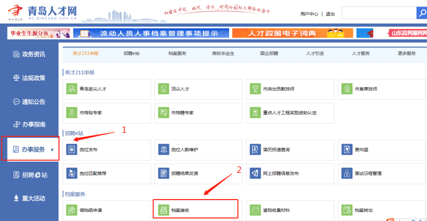畢業(yè)生可登陸“青島人才網(wǎng)”或關(guān)注“青島人才”微信公眾號(hào),進(jìn)入“辦事服務(wù)”/“辦事大廳”點(diǎn)擊“檔案接收”。根據(jù)系統(tǒng)提示填寫相關(guān)信息后提交審核,審核通過的可獲取調(diào)檔函,辦理檔案轉(zhuǎn)遞。