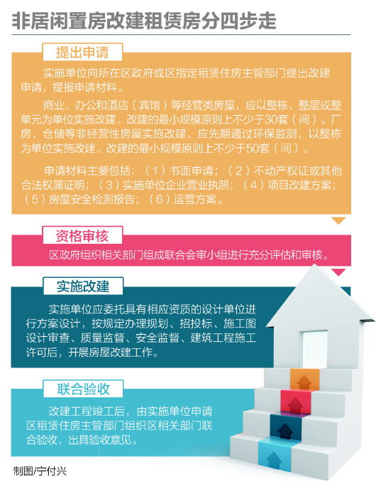 據(jù)介紹,本市范圍內(nèi)國有建設(shè)用地上已建成并具有一定規(guī)模的商業(yè)、辦公、酒店(賓館)、廠房、倉儲等非居住用途的閑置房屋,經(jīng)改建后安全、環(huán)保、自然通風、采光、人防、消防和配套設(shè)施等方面均符合居住要求的,可申請改建為租賃型住房。改建工作實施單位可以是不動產(chǎn)權(quán)利人,也可是受不動產(chǎn)權(quán)利人委托實際開展租賃運營的企事業(yè)單位(機構(gòu))。