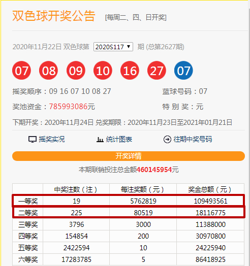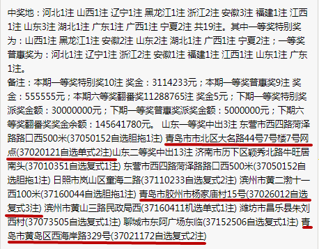 11月22日晚,中國福利彩票雙色球游第2020117期開獎,這是今年雙色球12億元大派獎活動第七期派獎。當(dāng)期雙色球紅球號碼為07、08、09、10、16、27,藍(lán)球號碼為07。10注一等獎特別獎887萬多元,六等獎翻番獎1128萬多注,當(dāng)期雙色球頭獎19注,其中10注為一等獎特別獎,單注獎金為887萬多元(含派獎311萬多元)。這10注一等獎特別獎花落7地,山西1注,黑龍江1注,安徽2注,山東2注,湖北1注,廣西1注,寧夏2注;另外9注為一等獎普惠獎,單注獎金為631萬多元(含派獎55萬多元)這9注一等獎普惠獎花落8地河北1注,遼寧1注,浙江2注,安徽1注,福建1注,江西1注,山東1注,廣東1注。當(dāng)期二等獎開出225注,單注金額8萬多元,其中山東的兩注一等獎特別獎被青島彩民斬獲。這2注一等獎出自一張投注額20元的自選單式(2倍)彩票對5注號碼分別進(jìn)行2倍投注,幸運(yùn)中得2注一等獎來自市北區(qū)大名路44號7號樓7號網(wǎng)點(diǎn),福彩37020121銷售站。
