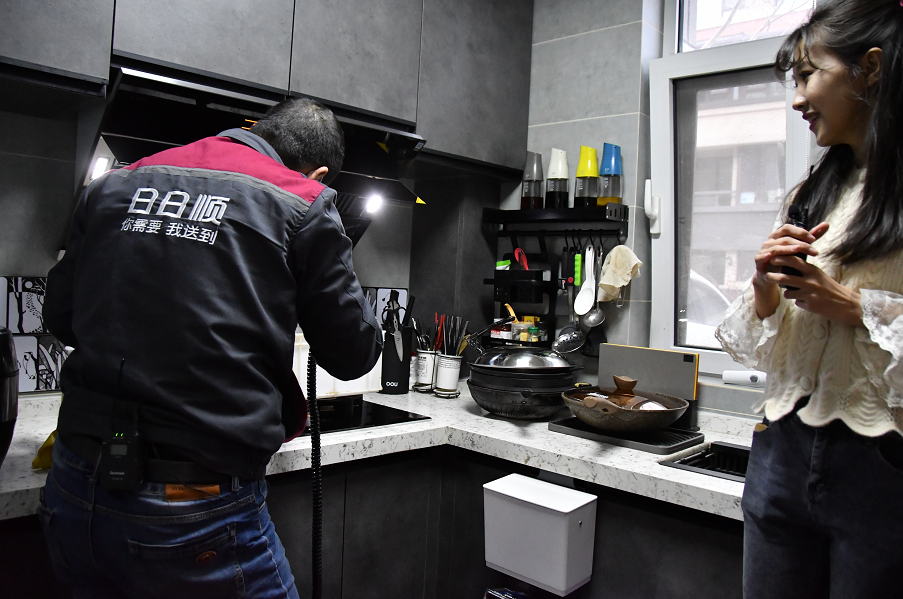 (日日順物流場(chǎng)景服務(wù)師為用戶進(jìn)行地暖清洗服務(wù))