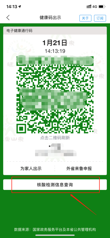 登錄“愛山東”APP,在首頁點擊“健康碼出示”,即可在彈出頁面最下方點擊相應模塊,顯示核酸檢測查詢結果。