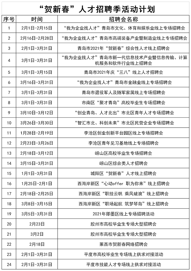 日前,青島啟動“賀新春”人才招聘季活動,為青島市企事業(yè)單位和求職人才搭建不打烊的對接平臺,將自2月1日至3月31日陸續(xù)進(jìn)行。截至目前,青島人才網(wǎng)已發(fā)起了24場線上招聘活動,227家企事業(yè)單位報(bào)名參會。