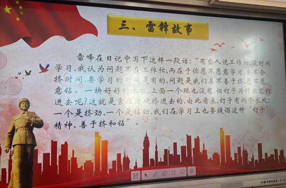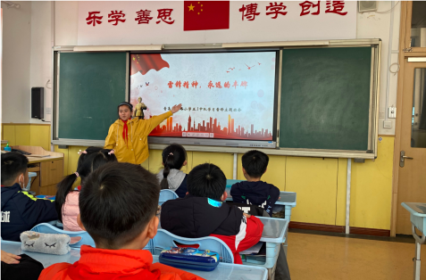 同學們通過課件展示、事跡宣講,共同了解雷鋒的生平事跡,初步明確雷鋒精神的內涵。