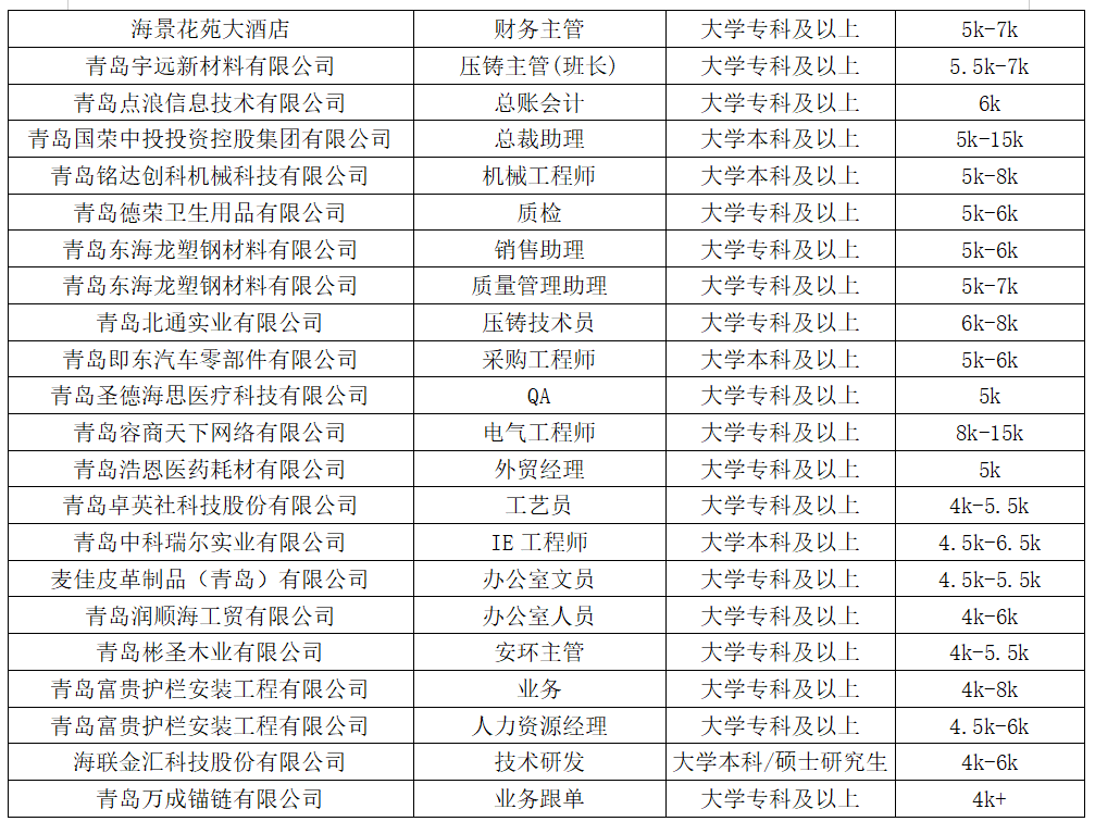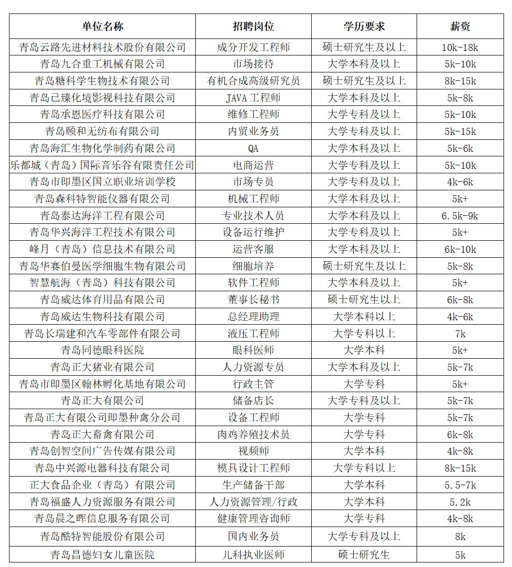 即墨區(qū)部分月薪5k+優(yōu)質(zhì)招聘崗位