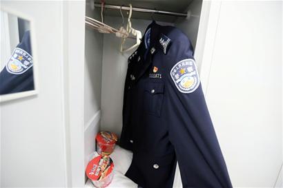 衣柜里還有兩桶未開封的方便面,李涌警號111871的警服整齊地掛在衣柜里。辦公桌上有一個兩升裝的塑料瓶子,以及兩個熟雞蛋。指導員趙永杰說,每次外出巡邏,李涌都要裝上滿滿一瓶子水,深夜食堂不開,雞蛋和方便面原本是等著巡邏結束后吃的。