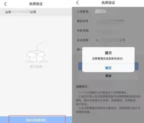 進入電子營業(yè)執(zhí)照模塊,點擊“授權(quán)他人管理執(zhí)照”,選擇要授權(quán)的公司營業(yè)執(zhí)照,點擊添加證照管理員,填寫證照管理員信息保存即可。