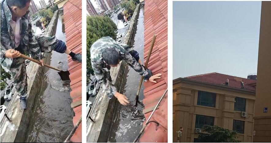 自六月份以來,雨水增多,街道內(nèi)的房屋出現(xiàn)了年久積水的問題,盧主任和盧委員趁著天晴,又穿了他們那身老舊的工裝服,兩位老同志頂著烈日,爬上屋頂,先是清理堵塞的下水口,排水之后,又清理屋頂沉積的沙土,和好水泥,再扛到屋頂進行修補,每桶水泥都有幾十斤重,兩位老同志齊心協(xié)力,一鼓作氣,扛了整整十幾桶水泥到屋頂。從屋頂下來的時候,厚厚的軍工裝全部被汗水濕透了。