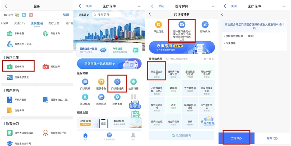 為方便家有慢性病、慢特病病人群體及家屬辦事,除到醫(yī)保工作站、定點醫(yī)院或醫(yī)保經(jīng)辦機構(gòu)辦理等門診慢特病辦理方式外,“愛山東?青e辦”APP接入了青島醫(yī)保門診慢特病掌上辦理新渠道,參保人可以使用“愛山東?青e辦”APP,足不出戶辦好門診慢特病待遇掌上申辦,讓病人及家屬“少跑腿”。首先在“愛山東?青e辦”APP首頁的頂部搜索欄搜索“醫(yī)療保障”應(yīng)用或在首頁“服務(wù)”詳情頁的“醫(yī)療衛(wèi)生”分類下找到“醫(yī)療保障”;然后,在應(yīng)用詳情頁的“門診慢特病”分類下,找到“基本醫(yī)療保險參保人員享受門診慢特病病種待遇認(rèn)定”,點擊進行待遇認(rèn)定申請并按提示如實填寫并上傳申辦材料,點擊“提交”即可。提交完成后,查詢審核結(jié)果可點擊“審批信息”按時間段搜索審批結(jié)果。除此之外申辦人可通過“門診慢特病辦理進度查詢”,隨時查詢辦理進度。