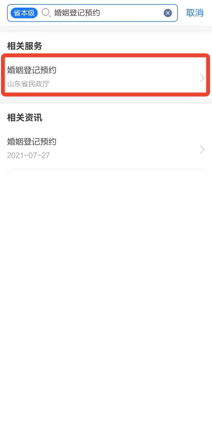 下載登陸“愛山東”APP,首頁(yè)搜索“婚姻登記預(yù)約”,點(diǎn)擊進(jìn)入(詳見圖1)。