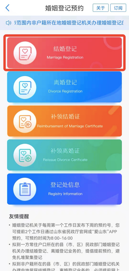 “愛山東”溫馨提醒:2月14日情人節(jié)結(jié)婚登記現(xiàn)已陸續(xù)開放預(yù)約,您可提前2個(gè)工作日通過“愛山東”移動(dòng)政務(wù)服務(wù)平臺(tái)進(jìn)行預(yù)約,預(yù)約時(shí)間為每個(gè)工作日的8:00-16:00。“愛山東”祝愿天下有情人: