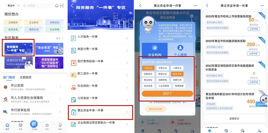 青島新聞網(wǎng)2月24日訊 按照全市智慧城市建設(shè)工作部署,市民營(yíng)經(jīng)濟(jì)局、市財(cái)政局依托“青島政策通”平臺(tái)推動(dòng)“惠企資金申請(qǐng)”一件事,平臺(tái)集在線申報(bào)、在線審批、結(jié)果公示、資金兌現(xiàn)、流程監(jiān)管等功能于一體,全面實(shí)現(xiàn)了財(cái)政惠企資金兌現(xiàn)的全流程服務(wù)。為方便企業(yè)申請(qǐng),“愛(ài)山東?青e辦”APP政務(wù)服務(wù)“一件事”專區(qū)上線了“惠企資金申請(qǐng)”一件事,實(shí)現(xiàn)了惠企資金申請(qǐng)“掌上辦”“指尖辦”。