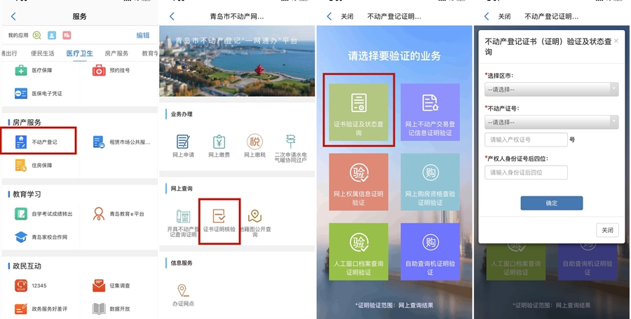 有需要的企業(yè)群眾只需三步,即可實現掌上驗證。首先,在“愛山東·青e辦”APP首頁點擊“更多”進入“服務”詳情頁,找到“房產服務”分類,點擊“不動產登記”,或直接在APP首頁搜索“不動產登記”。第二步,進入不動產登記網上辦事大廳后,在“網上查詢”模塊下,找到“證書證明核驗”,點擊進入即可進行驗證查詢。