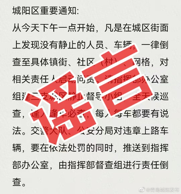 青島新聞網(wǎng)3月16日訊 今日,部分網(wǎng)友微信朋友圈和微信群中流傳“從今天下午一點(diǎn)開始,凡是在城區(qū)街面上發(fā)現(xiàn)沒有靜止的人員、車輛,一律倒查至具體鎮(zhèn)街、社區(qū)(村)、網(wǎng)格,對相關(guān)責(zé)任人啟動(dòng)問責(zé)”等內(nèi)容的消息,經(jīng)核實(shí)該信息不屬實(shí)。