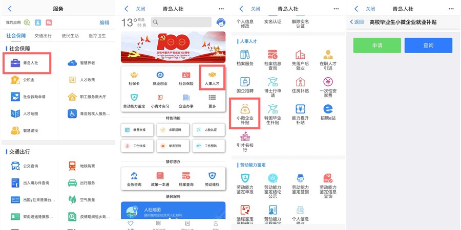 高校畢業(yè)生小微企業(yè)就業(yè)補(bǔ)貼標(biāo)準(zhǔn)每人每月400元,自首次申領(lǐng)補(bǔ)貼月份起36個(gè)月內(nèi)可享受補(bǔ)貼。以往符合條件的畢業(yè)生可登錄“青島人才網(wǎng)”申請(qǐng)?,F(xiàn)在,補(bǔ)貼申請(qǐng)又添新渠道。申請(qǐng)人可在“愛(ài)山東·青e辦”APP內(nèi)的青島人社應(yīng)用內(nèi)直接申請(qǐng)。首先,在“愛(ài)山東·青e辦”APP“服務(wù)”詳情頁(yè)找到社會(huì)保障分類(lèi)下的“青島人社”應(yīng)用;然后,在應(yīng)用詳情頁(yè)的“人事人才”欄目下,找到“小微企業(yè)補(bǔ)貼”模塊,進(jìn)入詳情頁(yè)后根據(jù)要求填寫(xiě)信息后提交補(bǔ)貼申請(qǐng)。申請(qǐng)完成后,還可點(diǎn)擊查詢(xún)按鈕,進(jìn)行已申請(qǐng)的補(bǔ)貼項(xiàng)目信息查詢(xún)。