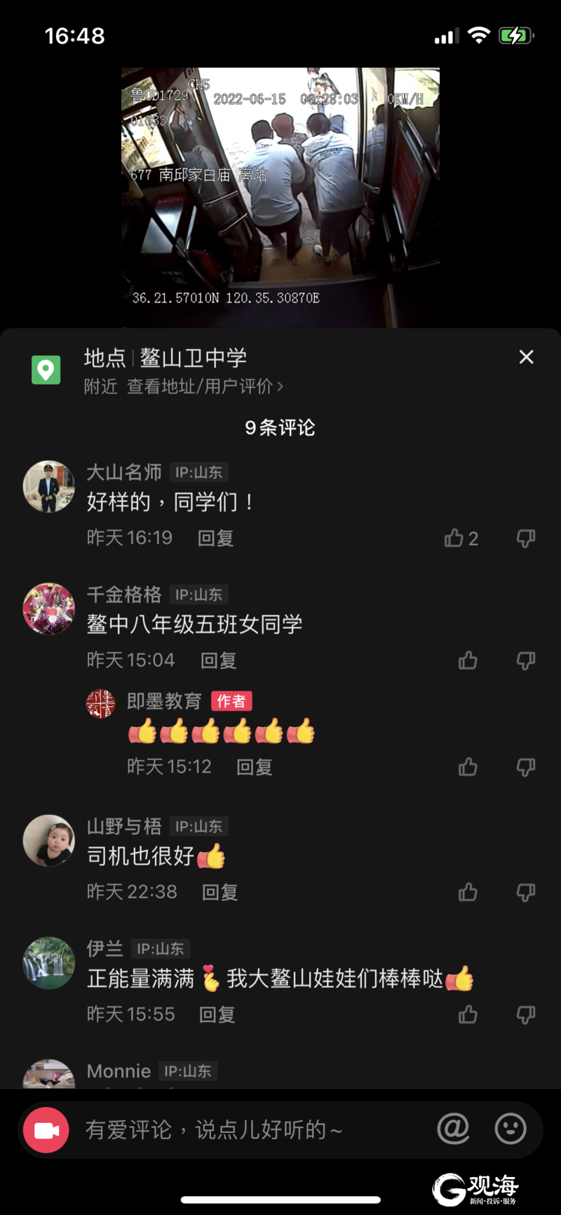 事情要從6月15日上午說起,當(dāng)時,溫馨巴士公司677路公交車的監(jiān)控拍下這暖心一幕:在即墨鰲山衛(wèi)南邱家白廟站,一位老太太下車時因腿腳不便步履緩慢,駕駛員陳正黨發(fā)現(xiàn)后,主動上前攙扶老人下車。期間,后座一女乘客也主動伸出援手。而這時,已經(jīng)下車的兩名女學(xué)生見狀,又折返回來,表示要送老人回家?!皟尚 睌v扶“一老”離開的背影,讓陳正黨和車上不少乘客大呼感動。