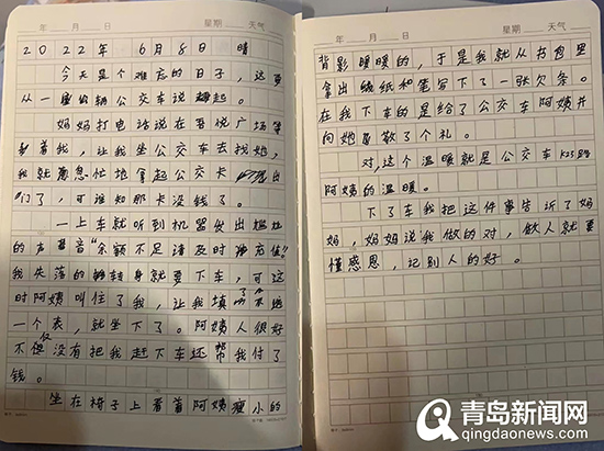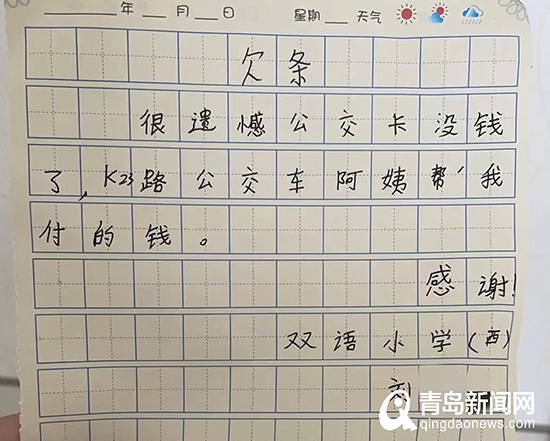 原來,在小劉來之前,媽媽周女士便向第四分公司撥打了一通表揚電話,事情的起因是周女士在女兒小劉的日記中發(fā)現(xiàn)了一個感人的故事。6月8日,小劉獨自乘坐K23路公交車到吾悅廣場車站找媽媽,但上車打卡時自己的學生卡響起了“余額不足,請及時充值”的提示音。小劉身上沒有帶錢,尷尬的轉身想要下車時,駕駛員崔慧叫住了她:“小朋友,快上車坐好吧,回家不要忘記讓媽媽幫你充卡呀?!毙Ⅻc點頭,一邊謝過善良的駕駛員阿姨,一邊找座位做好。路上,小劉看著駕駛員阿姨拿出一張公交卡幫助自己支付了一元車費,便從作業(yè)本中撕下一頁,寫下了一張“欠條”,還留下了自己對駕駛員阿姨的感謝。下車時,小劉將“欠條”交到了駕駛員阿姨手中,并敬了一個少先隊禮,表示感謝。