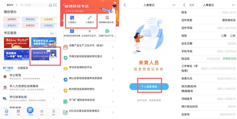 相關(guān)人員來(lái)青返青后,除第一時(shí)間主動(dòng)向所在社區(qū)(村居)或企業(yè)(單位)報(bào)到外,還要登錄“青島市入境人員信息系統(tǒng)”或“來(lái)青人員預(yù)登記系統(tǒng)”,如實(shí)申報(bào)登記有關(guān)信息。計(jì)劃來(lái)青返青的入境人員,由其親友或其親友告知本人提前72小時(shí)登錄“青島市入境人員信息系統(tǒng)”,如實(shí)申報(bào)登記有關(guān)信息。入青返青人員可在“愛(ài)山東·青e辦”直接進(jìn)行信息申報(bào),步驟如下。