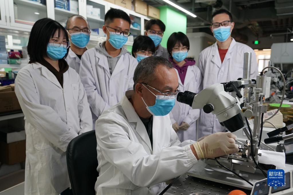 10月17日,北京腦科學(xué)與類腦研究中心聯(lián)合主任羅敏敏(前)在實(shí)驗(yàn)室為學(xué)生示范立體顯微注射操作。新華社記者 任超 攝