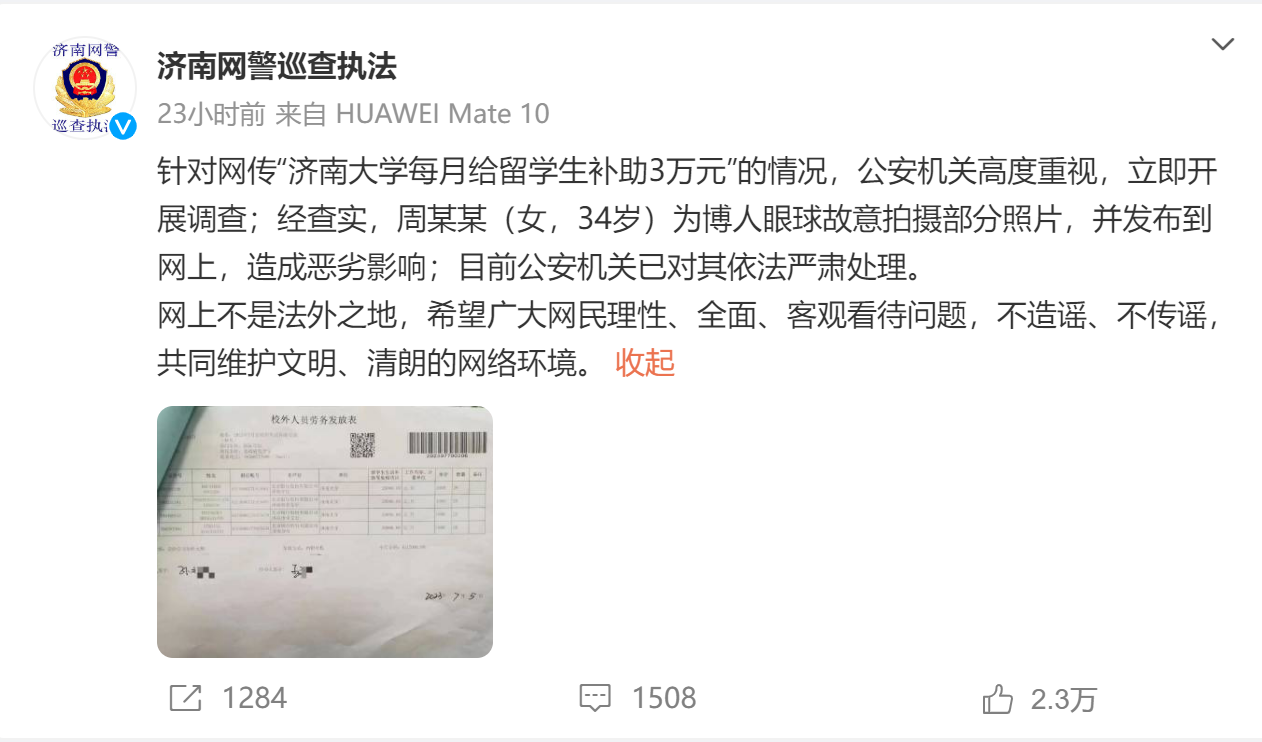 據(jù)@濟(jì)南網(wǎng)警巡查執(zhí)法:針對(duì)網(wǎng)傳“濟(jì)南大學(xué)每月給留學(xué)生補(bǔ)助3萬(wàn)元”的情況,公安機(jī)關(guān)高度重視,立即開(kāi)展調(diào)查;經(jīng)查實(shí),周某某(女,34歲)為博人眼球故意拍攝部分照片,并發(fā)布到網(wǎng)上,造成惡劣影響;目前公安機(jī)關(guān)已對(duì)其依法嚴(yán)肅處理。
