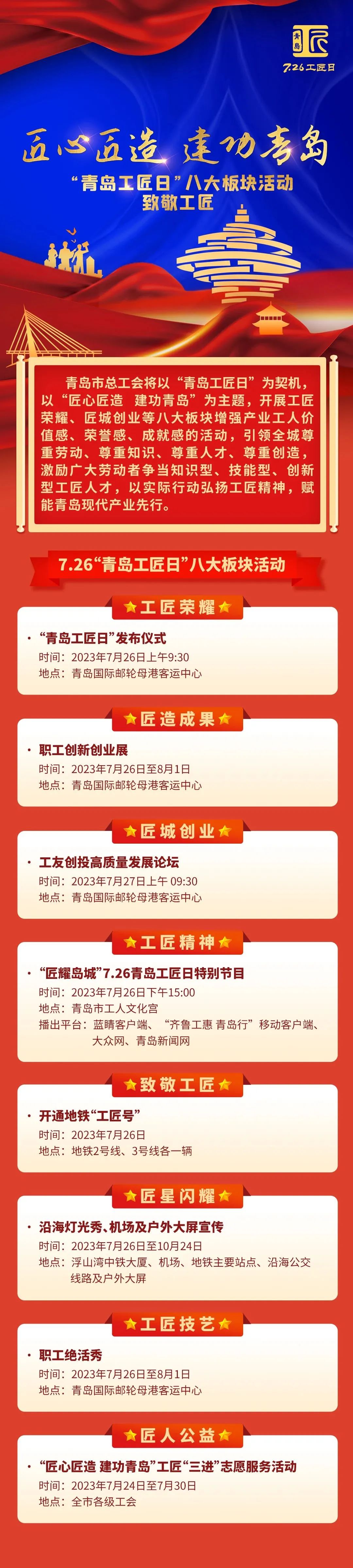 青島市總工會(huì)以“青島工匠日”為契機(jī),突出“匠心匠造建功青島”主題,設(shè)置“工匠榮耀”“匠造成果”“匠城創(chuàng)業(yè)”“工匠精神”“致敬工匠”“匠星閃耀”“工匠技藝”“匠人公益”等八大板塊,增強(qiáng)產(chǎn)業(yè)工人價(jià)值感、榮譽(yù)感,激勵(lì)廣大勞動(dòng)者爭(zhēng)當(dāng)知識(shí)型、技能型、創(chuàng)新型人才,以實(shí)際行動(dòng)弘揚(yáng)工匠精神,培育技能人才,賦能青島現(xiàn)代產(chǎn)業(yè)先行。