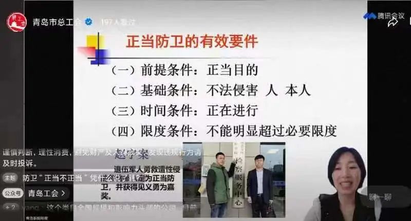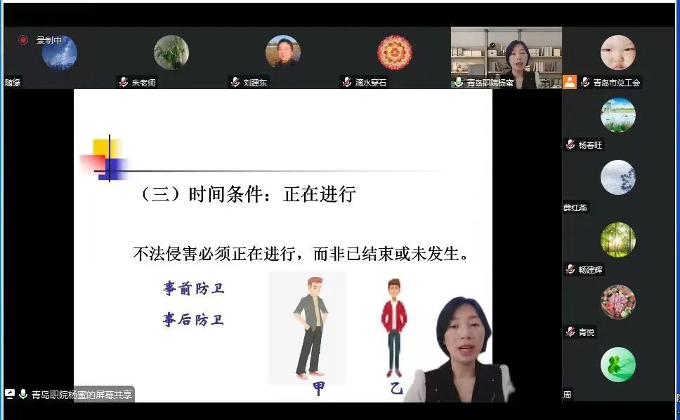 此次講座邀請了青島職業(yè)技術學院馬克思主義學院楊蜜教授作題為《防衛(wèi)“正當不正當”憑什么說了算?》的“公益大講堂”線上講座。楊蜜結合實際案例,從日常生活中出發(fā),詳細的介紹了什么情況下屬于正當防衛(wèi),正當防衛(wèi)的前提條件、基礎條件、時間條件以及限度條件等。講座案例生動豐富,講授清晰準確、自然流暢,不斷得到大家線上的點贊、獻花和掌聲。