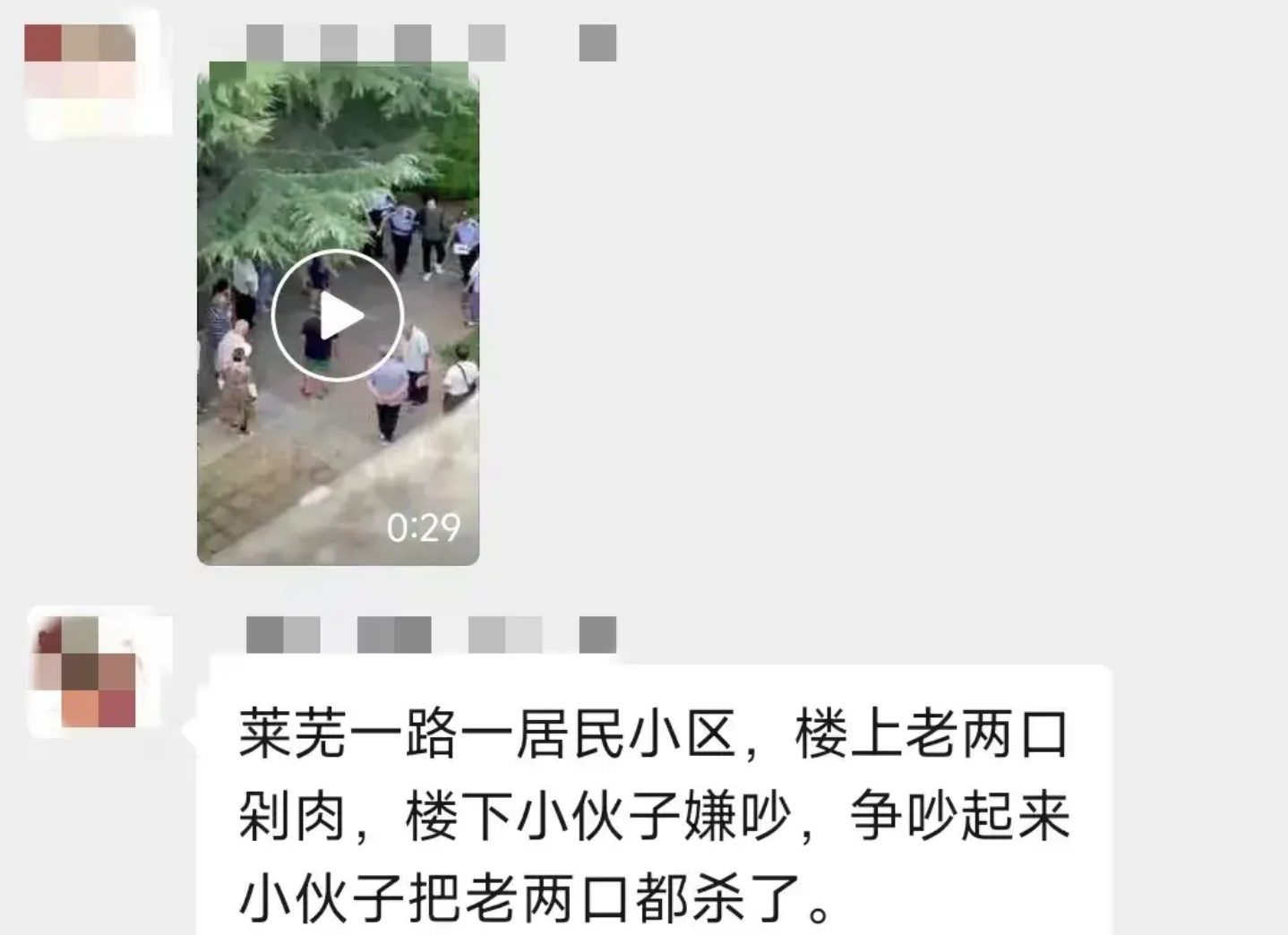 8月7日下午,青島地區(qū)部分微信群中出現(xiàn)一則搭配“萊蕪一路一居民小區(qū),樓上老兩口剁肉,樓下小伙子嫌吵,爭吵起來小伙子把老兩口都?xì)⒘恕!弊謽拥囊曨l內(nèi)容,引發(fā)社會關(guān)注。