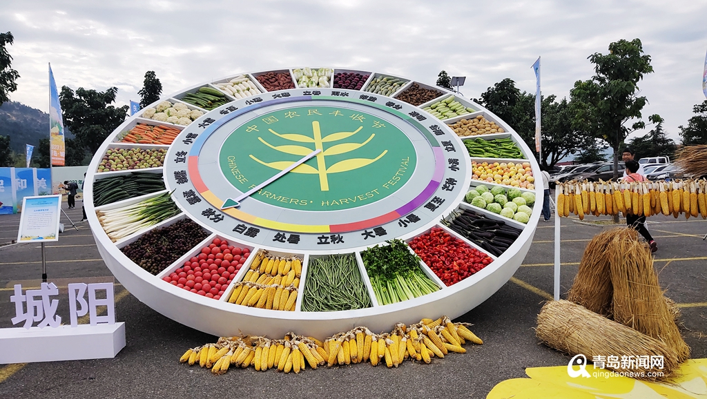 主會(huì)場(chǎng)門口,有巨大的“二十四節(jié)氣”實(shí)物裝置,每個(gè)節(jié)氣的格子里放著四時(shí)蔬果,指針指向“秋分”,吸引眾多市民游客興致盎然打卡留念。