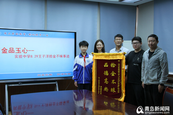 青島新聞網(wǎng)9月26日訊(記者 任俊峰)9月25日,青島市城陽區(qū)實(shí)驗(yàn)中學(xué)明德樓二樓會議室召開一場特別的表彰會,失主曹先生將繡有“拾金不昧,品德高尚”的錦旗送到城陽區(qū)實(shí)驗(yàn)中學(xué)八年級二十九班王子洋同學(xué)手中,對他拾金不昧的暖心善舉以示感謝。