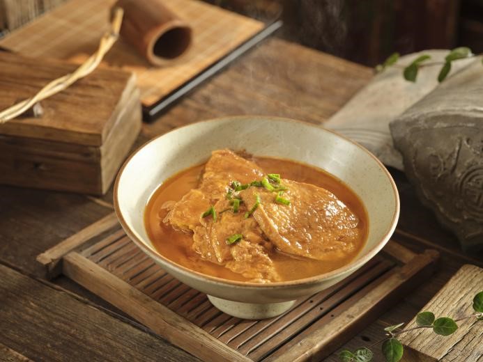 一勺蛋液倒入烤熱的大鐵勺中,隨著“呲啦”聲把蛋液晃勻成一個(gè)圓形的蛋餅,再把肉餡放進(jìn)去合上就完成了。再與素雞同燒,吸汁入味,源于家常菜,卻又滋味更足。