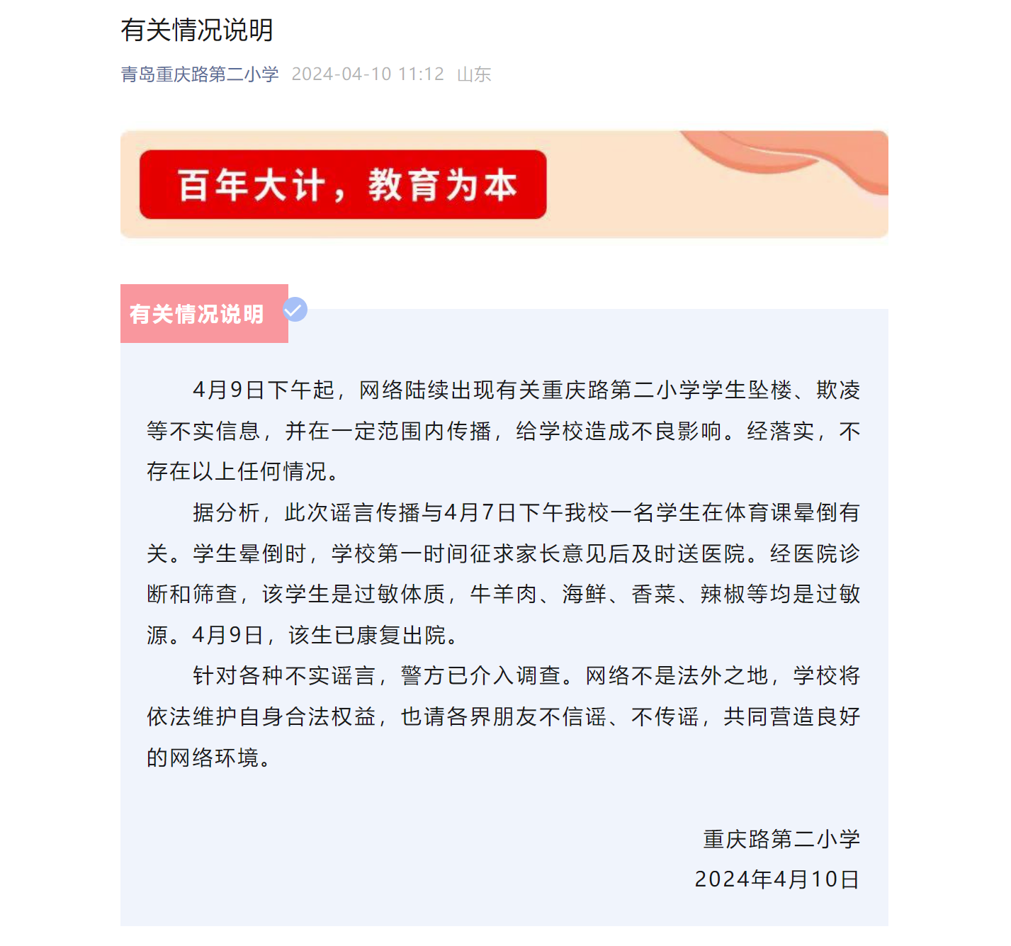 4月10日,青島重慶路第二小學(xué)發(fā)布官方情況說(shuō)明,經(jīng)查證,以上信息均為謠言。目前,警方已經(jīng)針對(duì)各種不實(shí)謠言介入調(diào)查。