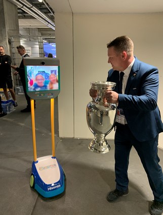 自6月14日歐洲杯開賽以來,印有醒目海信logo的互動機器人活躍在賽場周邊。通過小小的一塊屏幕,不同國家的住院兒童可以參觀平時無法進入的球員賽前熱身區(qū)、球隊更衣室等區(qū)域,跟自己喜歡的球員或者球隊進行實時互動。借助這種方式,無法親自前往球場的孩子們離自己的足球夢想更進一步,親切地體會到足球運動的樂趣。