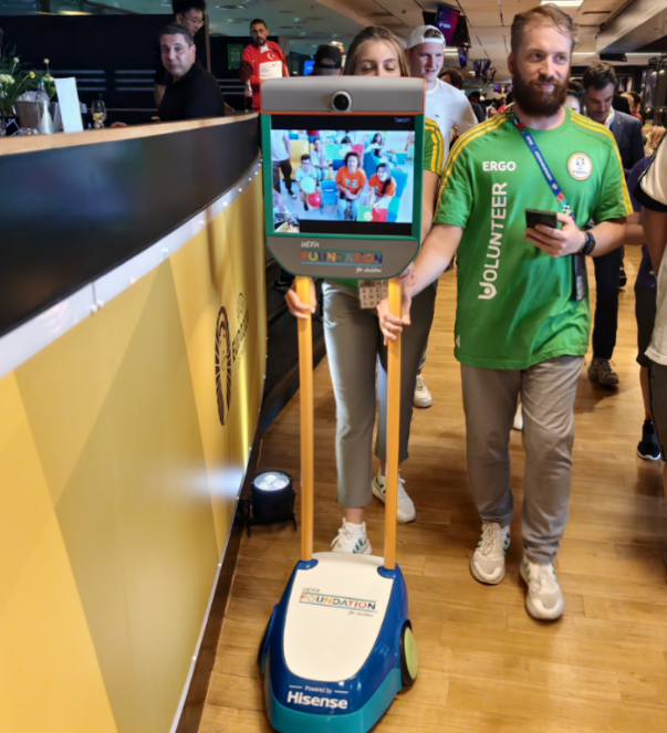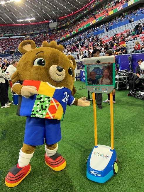 來自法國里昂的癌癥治療中心的住院兒童通過機器人參觀了法國隊更衣室,并與法國隊球星姆巴佩、吉魯、格列茲曼等進行了親密互動,同時通過機器人在球場周圍觀看了球員熱身,隨后進入了球場VIP長廊,與法國足協(xié)主席菲利普·迪亞洛進行了互動。除此之外,意大利著名守門員布馮,以及現(xiàn)役主力門將多納魯馬、葡萄牙球星C羅、佩佩、萊奧、若塔等均在比賽前,依次通過機器人與連線的小朋友進行了互動,積極參與到助力兒童圓夢歐洲杯的公益活動中。