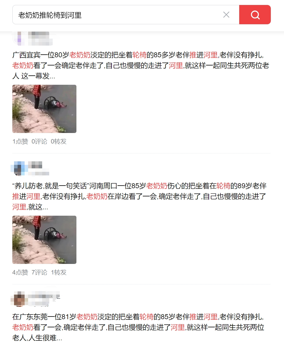 通過觀看原視頻可以發(fā)現(xiàn),老奶奶推的輪椅為空輪椅,并沒有人坐在輪椅上,“把老伴推進河里”的事實并不存在。另外,青島新聞網(wǎng)記者通過搜索近似文本和圖片可以發(fā)現(xiàn),在眾多網(wǎng)絡(luò)平臺中有許多類似消息,但時間地點大不相同,無法確定該事件發(fā)生在青島。青島公安也表示最近沒有接到相關(guān)報案。