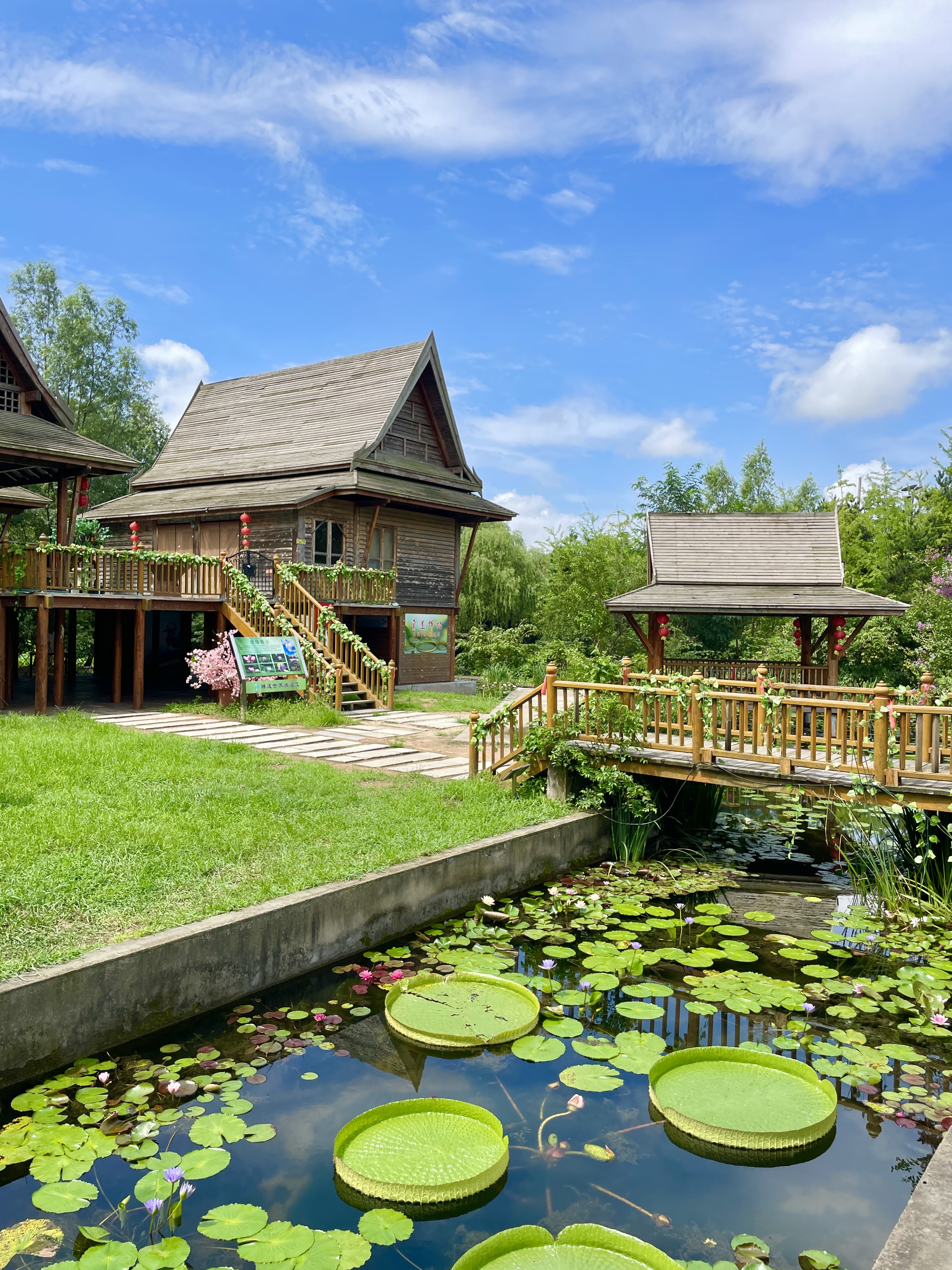 莫奈花園里古色古香的涼亭悠然立于睡蓮之上,置身其中仿佛掉進莫奈的畫作中,蔥郁的綠樹作為天然背景板,更增添了幾分清新與生機。盛夏時分大王蓮C位出道,輕輕搖曳在碧波之上,還可以坐在里面拍照,實現(xiàn)小時候拇指姑娘的童話夢。睡蓮花期從4月持續(xù)到10月份,建議上午去,睡蓮開得又多又大。