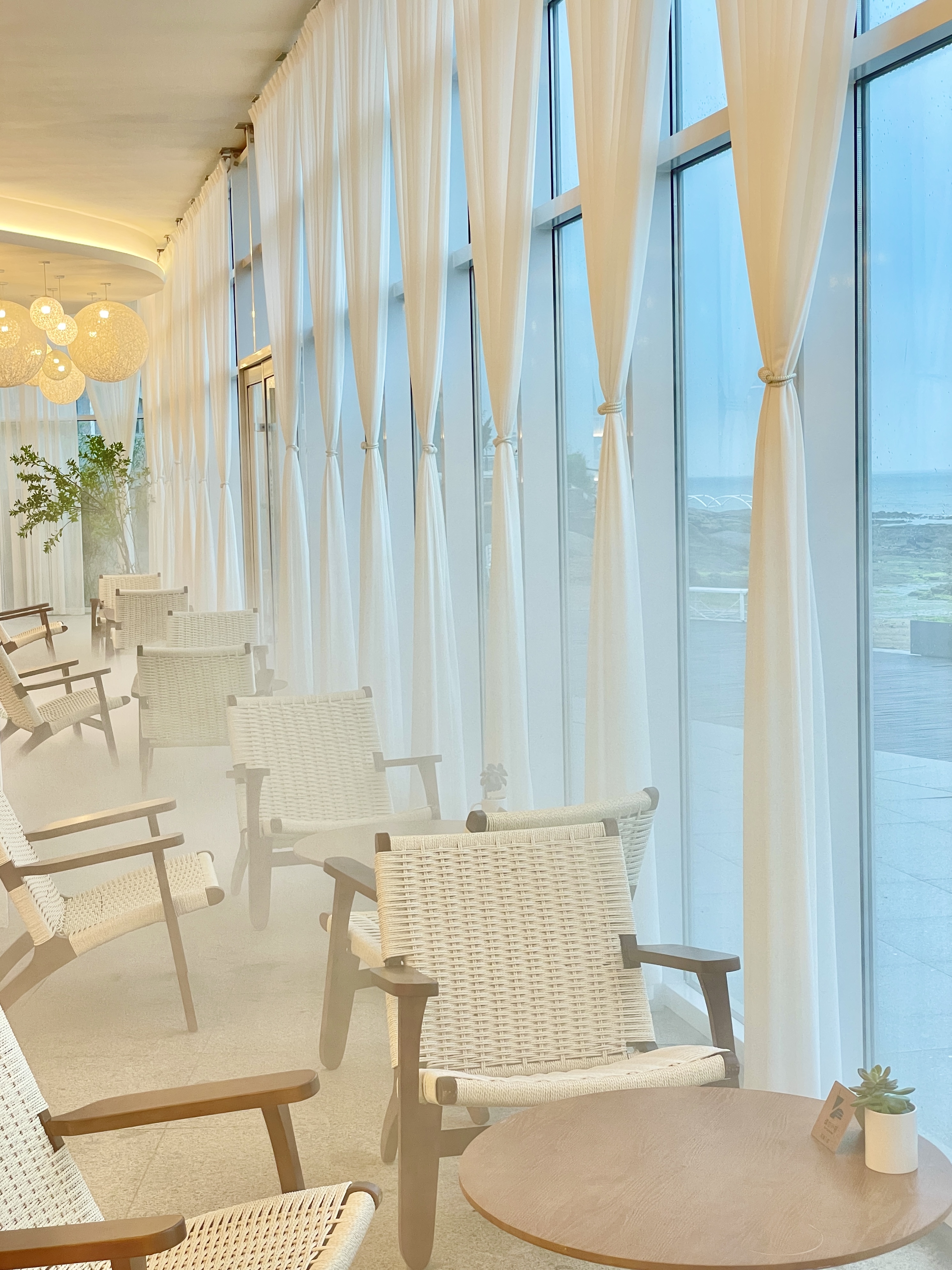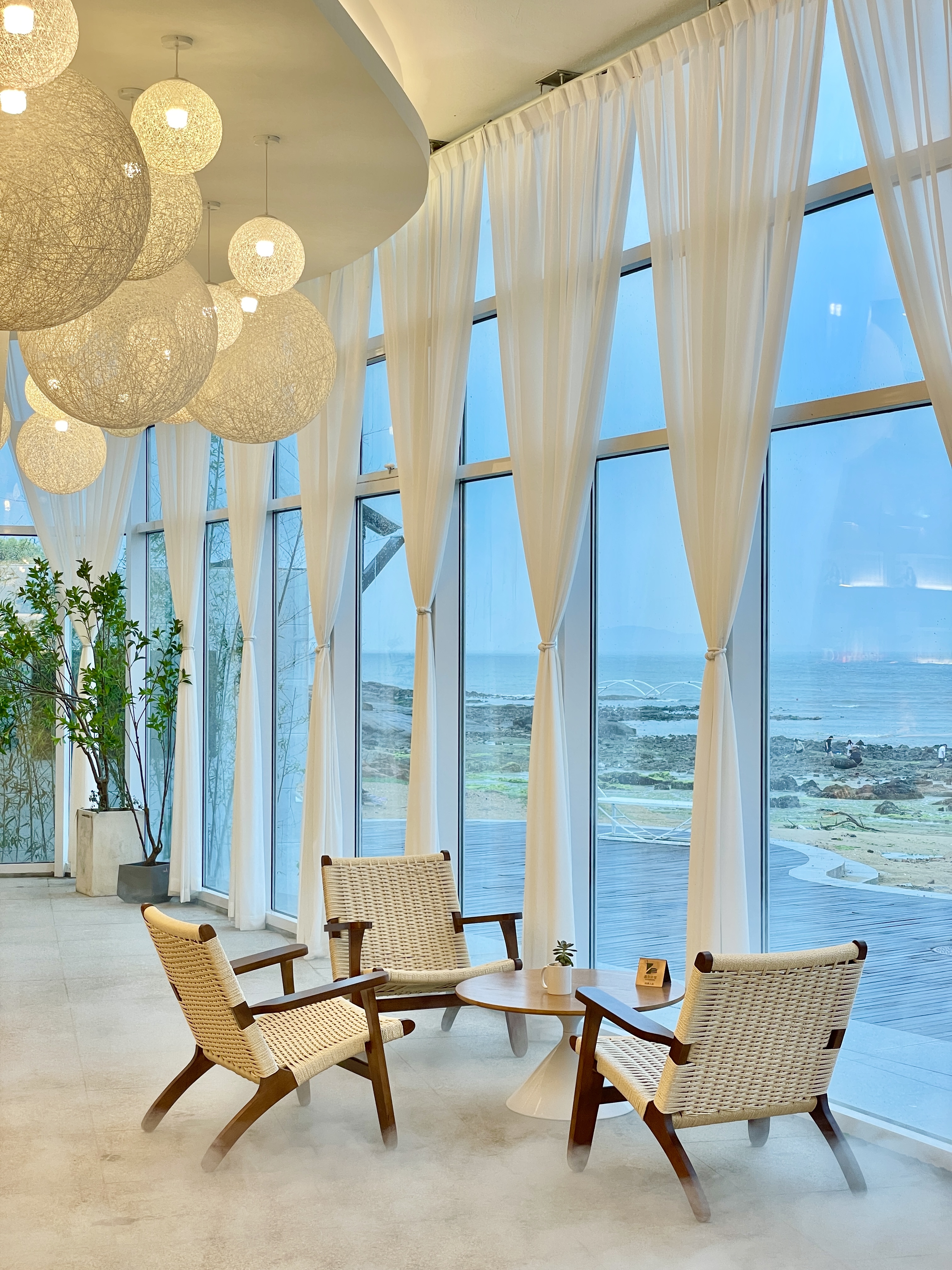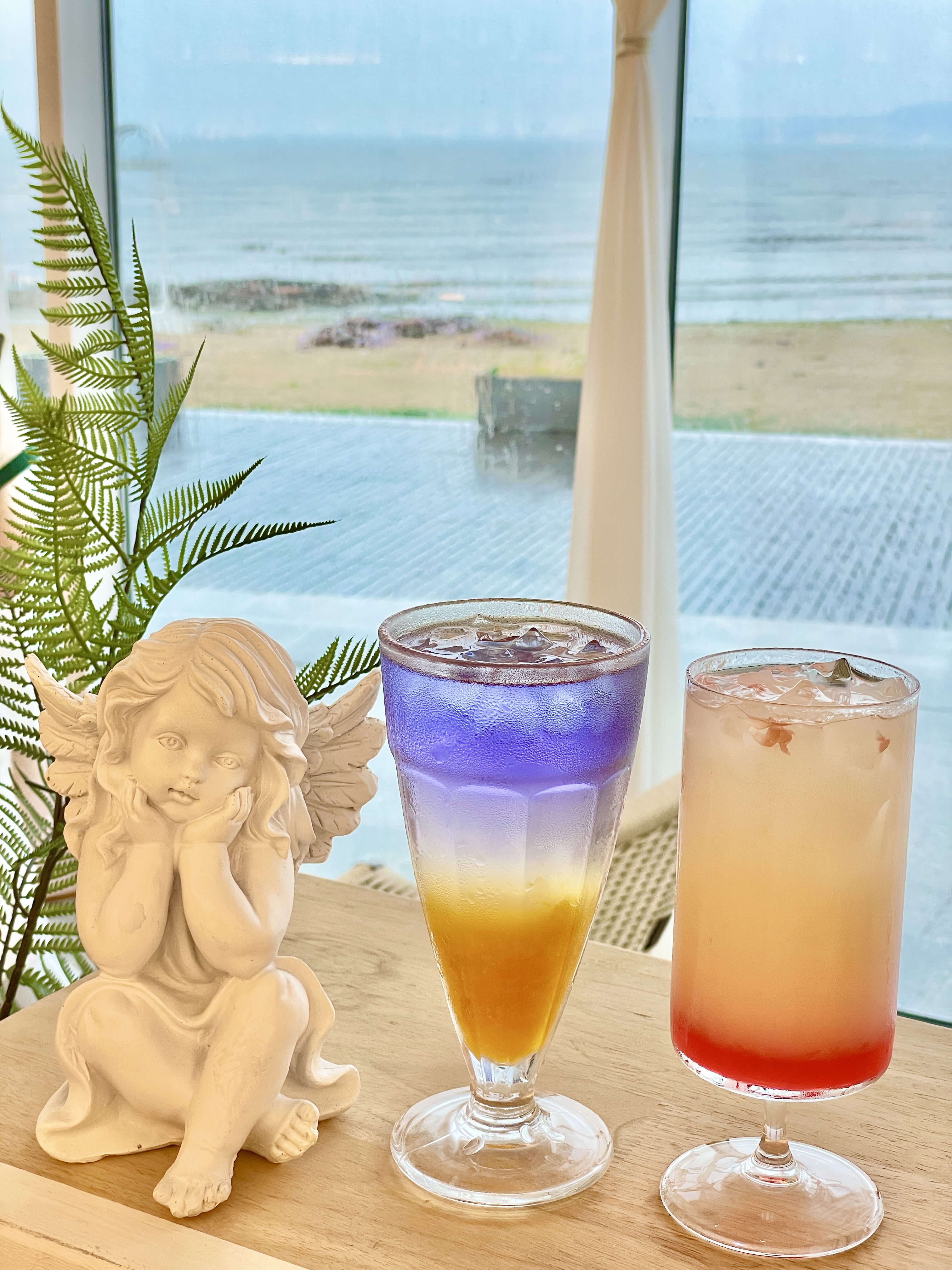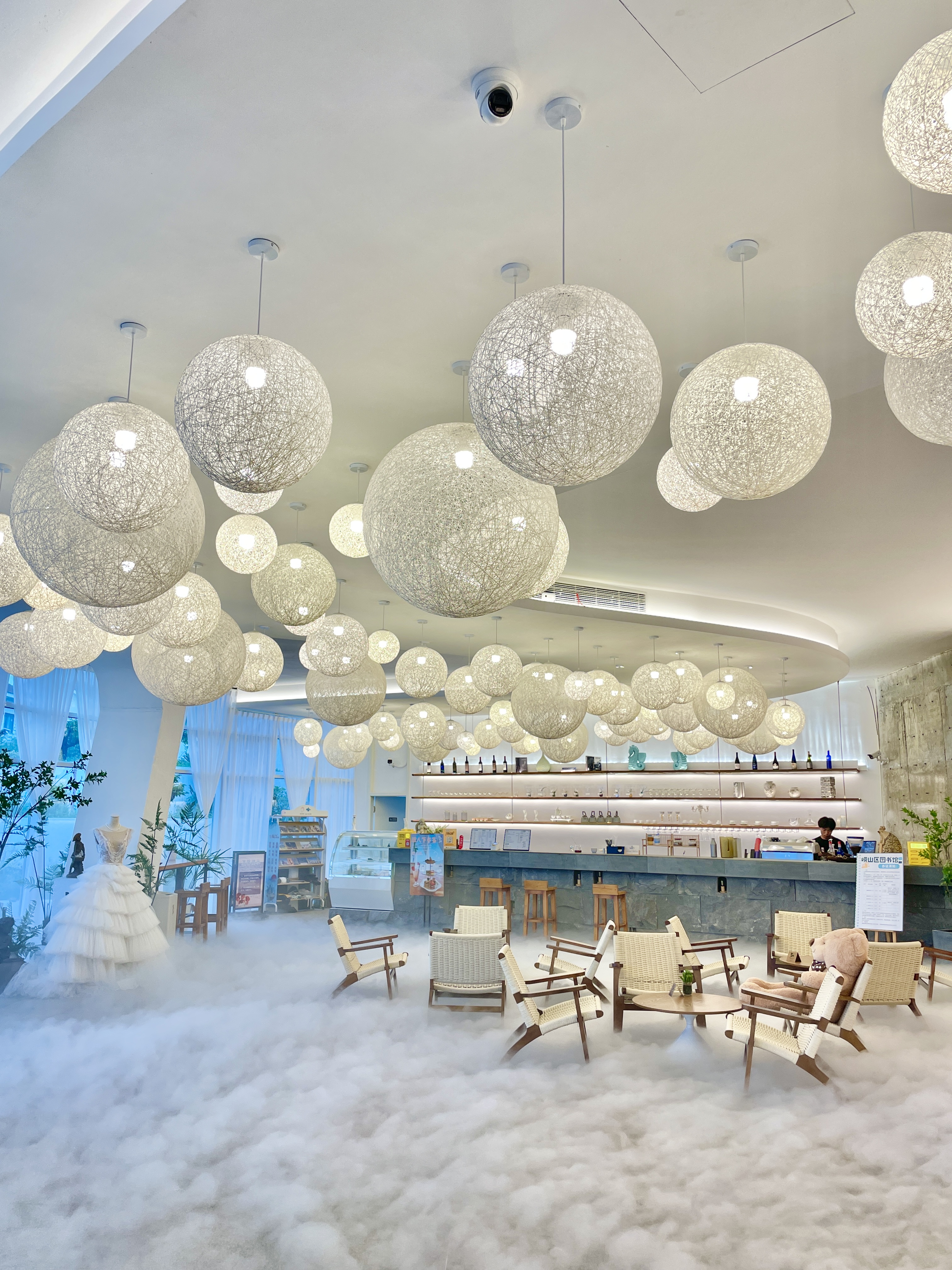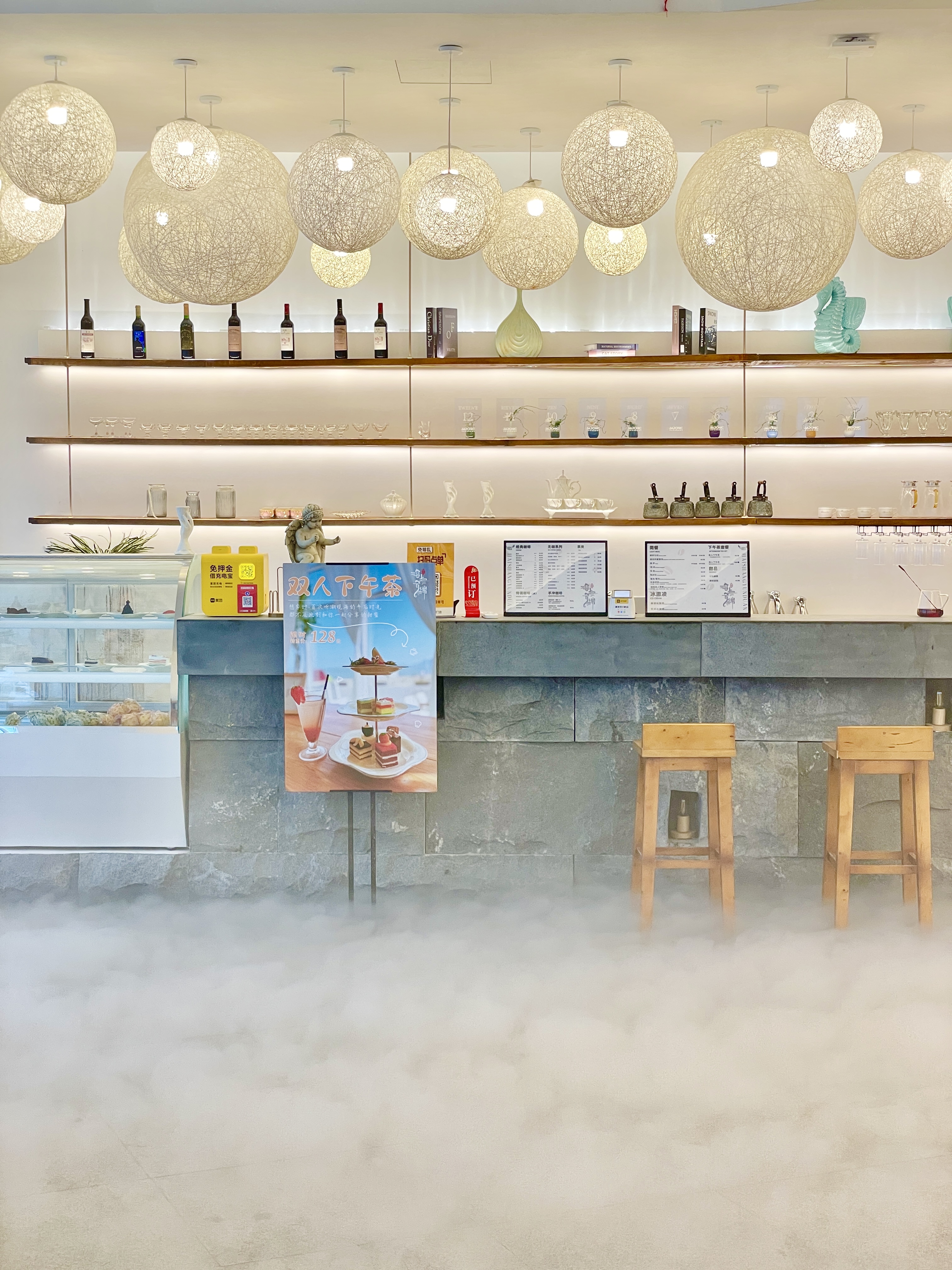 咖啡、特調(diào)、無咖飲品、茶飲、簡餐、甜品、冰激凌......都有,也很適合帶小朋友打卡。天氣晴好的時候去趕個海,玩累了回店里吃吃喝喝看看書,每天還有仙氣飄飄的水霧仙境,“海上云端”真是名副其實。