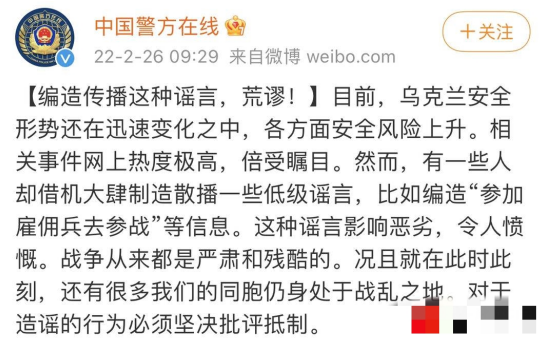 針對(duì)此類(lèi)謠言,@中國(guó)警方在線曾經(jīng)表示,這種謠言影響惡劣,令人憤慨。戰(zhàn)爭(zhēng)從來(lái)都是嚴(yán)肅和殘酷的,況且就在此時(shí)此刻,還有很多我們的同胞仍身處于戰(zhàn)亂之地。對(duì)于造謠的行為必須堅(jiān)決批評(píng)抵制。