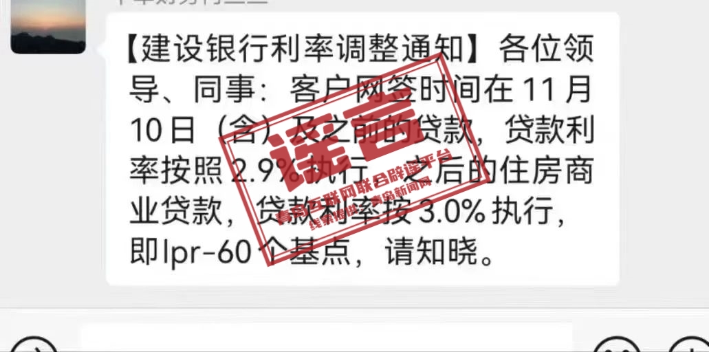 在青島的微信朋友圈、微信群中,一張微信對話截圖流傳,內(nèi)容是“【建設(shè)銀行利率調(diào)整通知】各位領(lǐng)導(dǎo)、同事:客戶網(wǎng)簽時間在11月10日(含)及之前的貸款,貸款利率按照 2.9%執(zhí)行,之后的住房商業(yè)貸款,貸款利率按 3.0%執(zhí)行,即lpr-60個基點(diǎn),請知曉?!?/p>