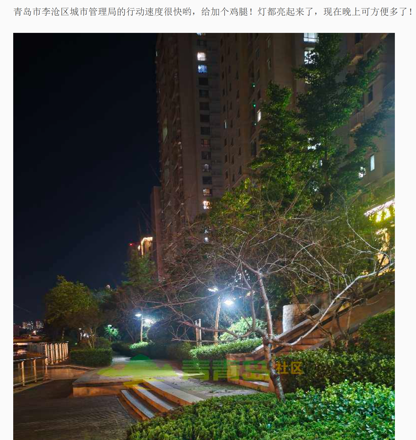 網(wǎng)友隨后跟帖點贊處理結(jié)果:“青島市李滄區(qū)城市管理局的行動速度很快喲,燈都亮起來了,現(xiàn)在晚上可方便多了!”