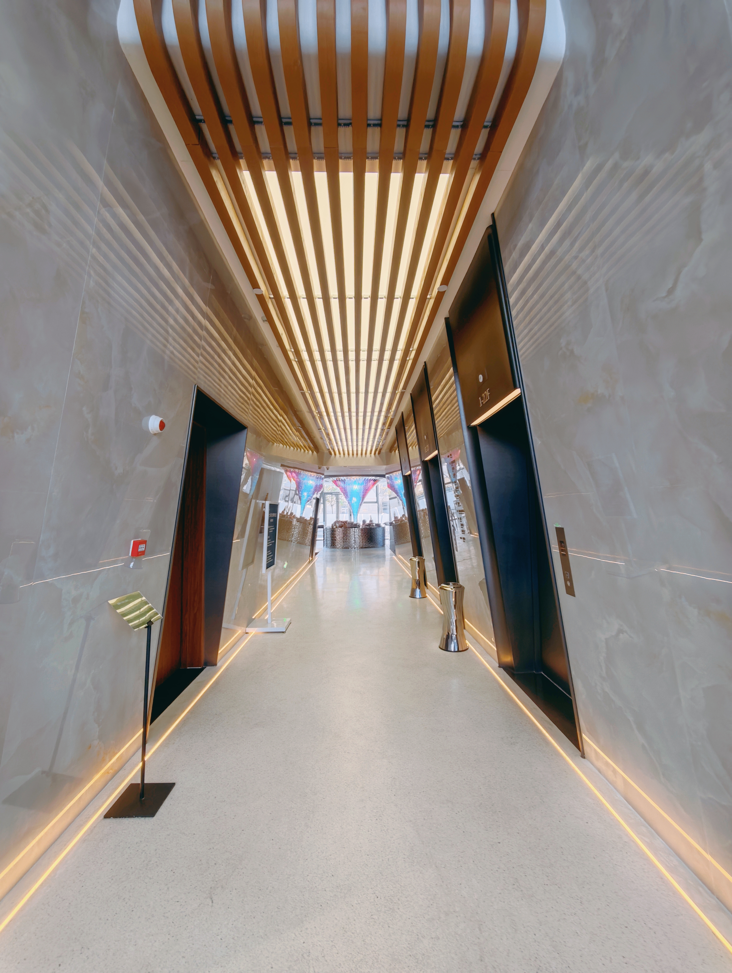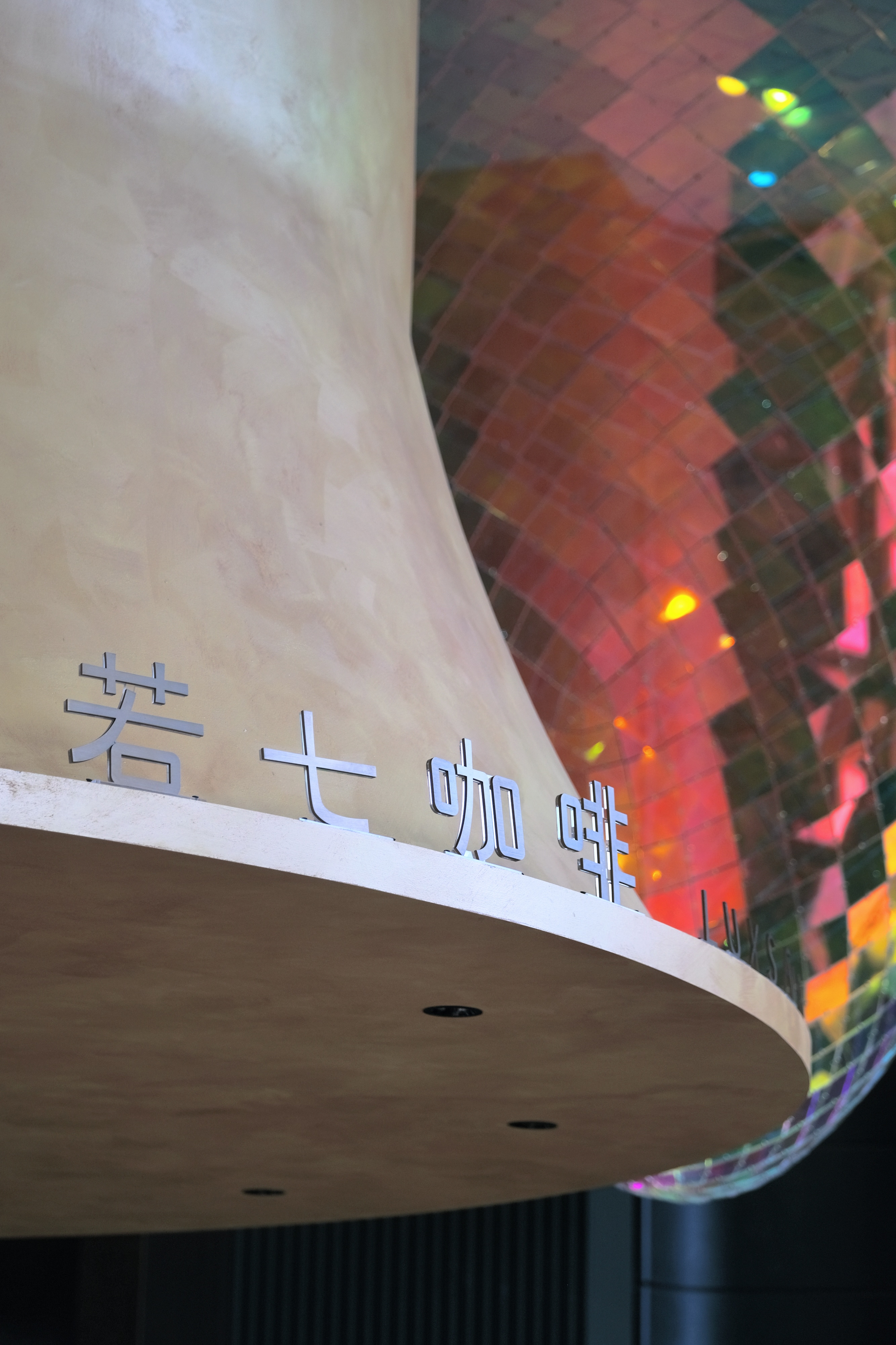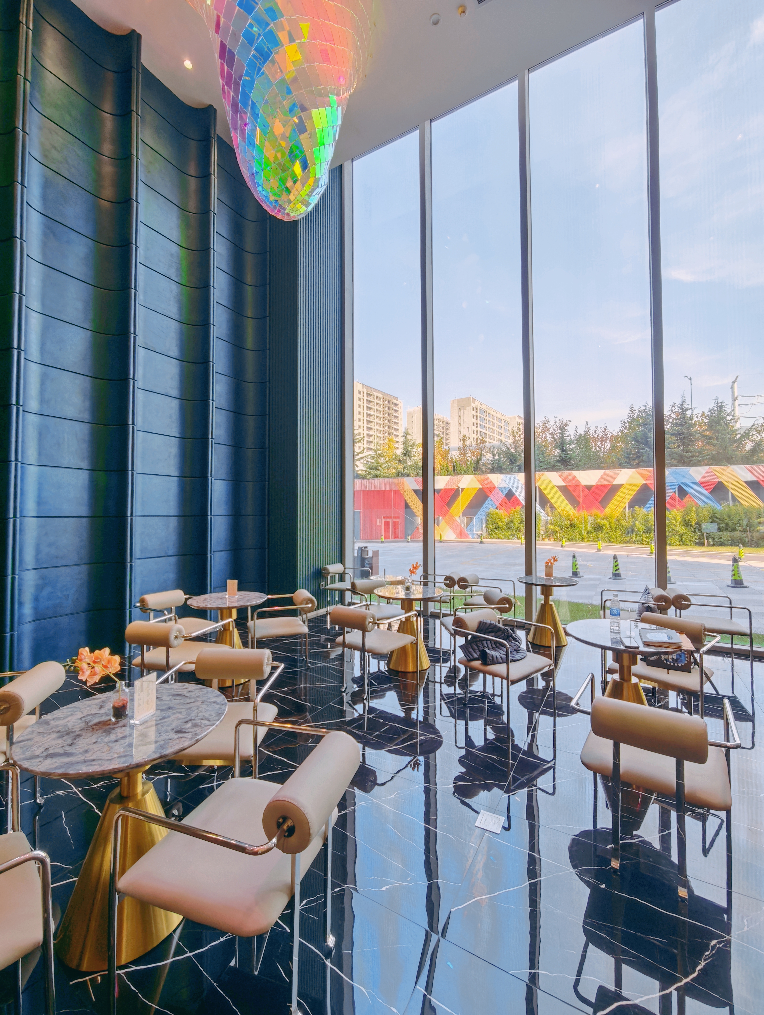 咖啡廳以“溫暖明亮”為設(shè)計基調(diào), 主視覺藝術(shù)裝置《見山》靈感源自嶗山十二景之一“太清水月”,以一種極具創(chuàng)意的倒影方式重構(gòu)嶗山山貌,運用當(dāng)代裝置語言,生動還原了“山映海上,虛實相融”的意境,從不同時間、不同角度去觀賞它時,會產(chǎn)生類似水波的光影變化,那靈動的光影仿佛在訴說著“水月映山”的詩意故事。